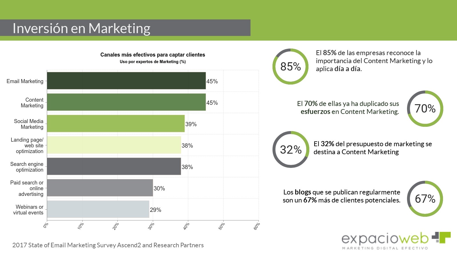 Algunas de estas prácticas se llevan gran parte del presupuesto total dirigido a marketing. En concreto, el 32% de éste está destinado al marketing de contenidos. El 85% de las empresas ya reconoce su importancia y el 70% ha doblado sus esfuerzos en esta herramienta.