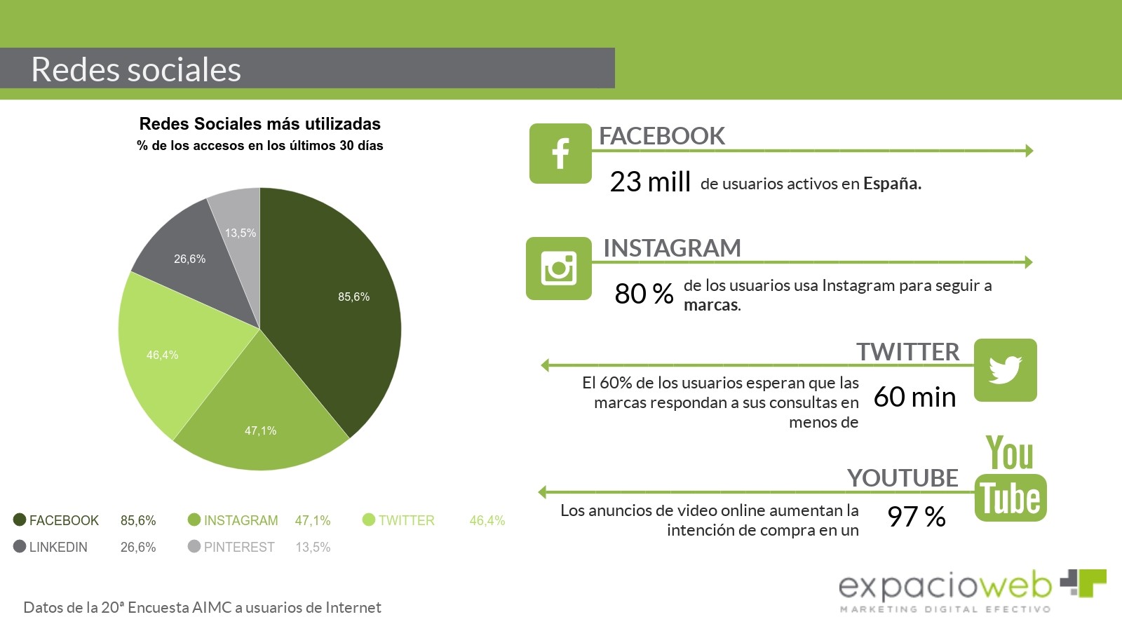Con 23 millones de usuarios activos en España, Facebook es la red social más usada en nuestro país. Es una red social para toda la familia. Con un perfil de usuarios muy variado, esta red social es usada tanto por hombres como por mujeres y en una franja de edad muy variada. Por lo tanto, cualquier empresa inteligente debería estar presente en Facebook.