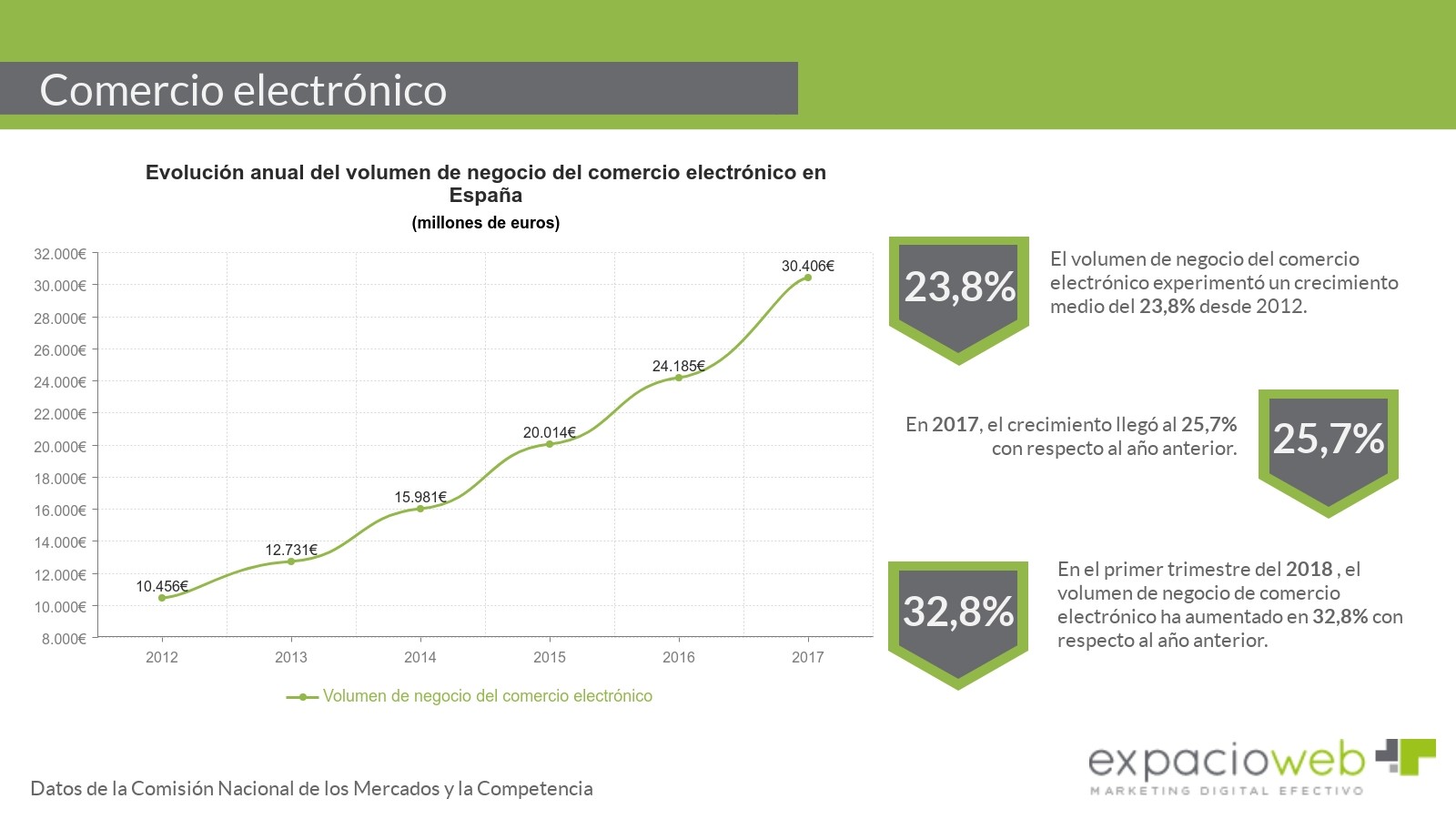 El comercio electrónico en España no deja crecer en volumen de negocio. Desde el 2012 hasta el pasado año el crecimiento ha sido del 190%, con una subida media anual de 23,8%. ¿Parece que vender por Internet empieza a ser interesante, no? Pues más te lo parecerá si sigues leyendo. El ritmo de crecimiento no deja de aumentar, y si en 2017 el volumen de negocio creció en 25,7%, en el primer semestre de este año lo hizo en un 32,8%. Los sectores con más ingresos han sido: agencias de viajes y operadores turísticos con el 14,4% de la facturación total, transporte aéreo con el 11,9% y las prendas de vestir con el 5,4% del total.