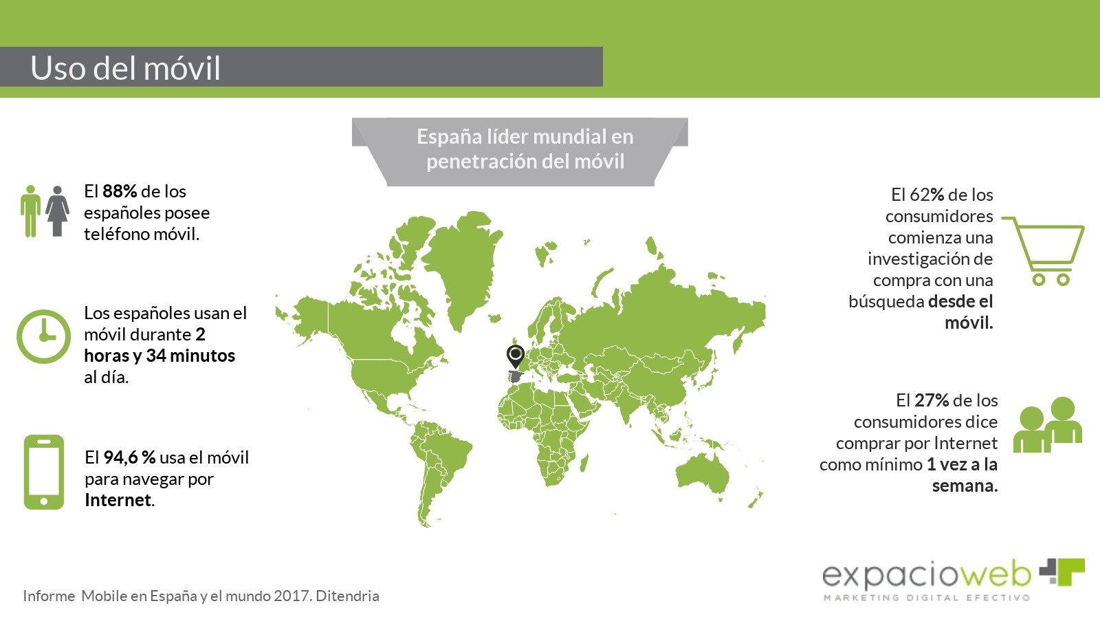 En 2017, existían 4,9 millones de usuarios de móviles en el mundo, lo que quiere decir que, el 66% de la población mundial posee un teléfono móvil. En España, este porcentaje asciende al 88%, lo que sitúa a nuestro país en el líder mundial en penetración del móvil, por delante de Singapur, Italia y Japón. Este dispositivo se ha establecido como el más usado para la conexión a Internet seguido del ordenador o portátil. El 94,6% de los españoles utilizaron el móvil para acceder a la red, frente a un 73,6% del portátil.
