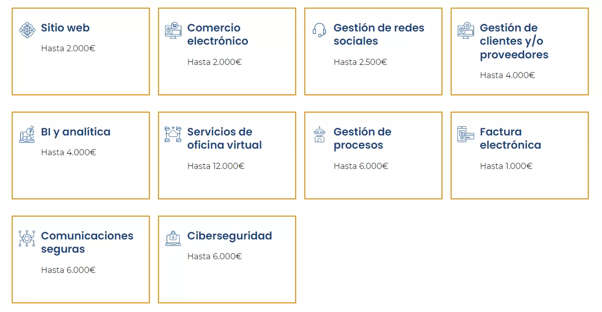 El programa proporcionará a las empresas un bono de digitalización que podrán utilizar para comprar soluciones digitales ya disponibles en el mercado en ámbitos como la elaboración y gestión de páginas web, presencia en internet, comercio electrónico, gestión de clientes, ciberseguridad, gestión de proveedores y oficina digital.