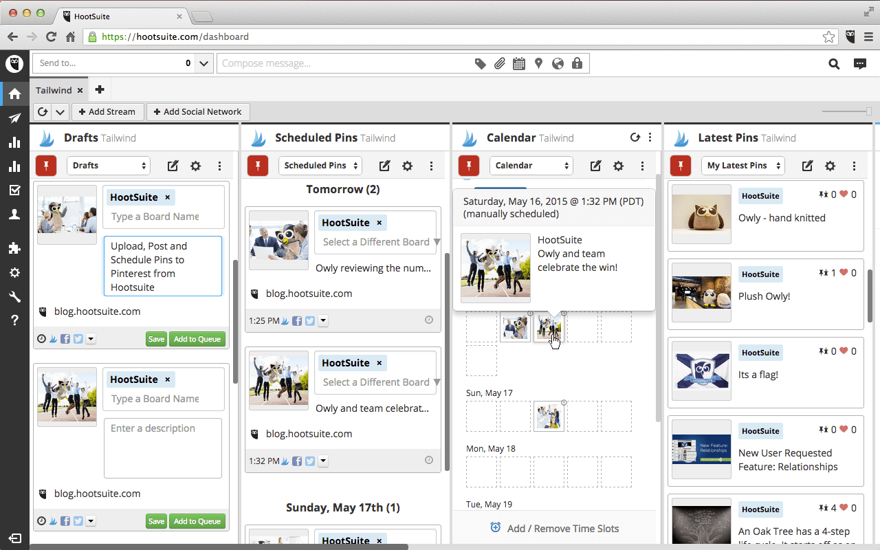 Sin duda, Hootsuite es una aplicación de gestión todo en uno. Gracias a su avanzado panel de control, te permite publicar y compartir desde Twitter, Facebook, Instagram, Google+ y Linkedin, abarcando todos tus perfiles en cada post.Te permite gestionar múltiples cuentas y puedes llevar a cabo numerosas tareas desde un solo sitio, como escribir actualizaciones, insertar enlaces, subir fotos y gestionar menciones, likes y shares.