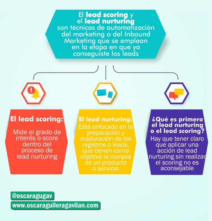 -Con el lead scoring ordenas y segmentas  la base de datos. Con el lead nurturing realizas el acompañamiento y madurez del cliente durante el proceso de compra.