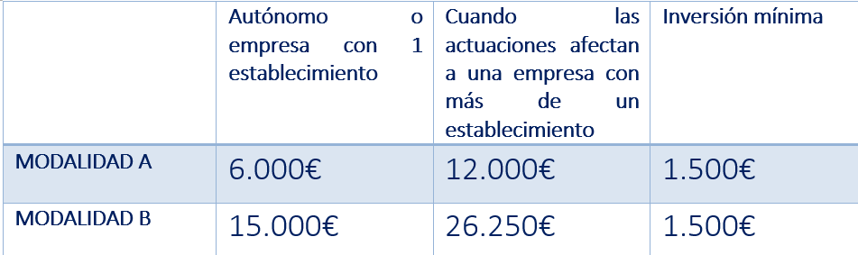 Modalidades B (gastos ocasionados por la realización de obras o reformas de acondicionamiento interior o exterior de los locales comerciales o establecimientos artesanos, tales como obras de albañilería, fontanería, carpintería y pintura; puertas y ventanas; instalación de suelos…; gastos ocasionados por el equipamiento de locales comerciales o establecimientos artesanos que consistan en la adquisición e instalación del equipamiento y mobiliario de uso exclusivo en la superficie de exposición y venta o en la adquisición e instalación de equipamiento y maquinaria destinada al desarrollo de la actividad artesana; y los los costes de los servicios profesionales de elaboración y redacción de los proyectos.
